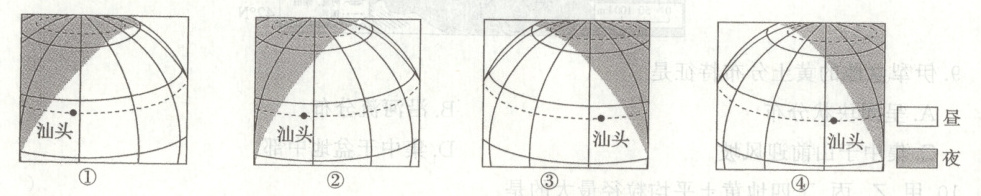 15. “两大盛会”闭幕时,汕头与晨昏线位置关系正确的是