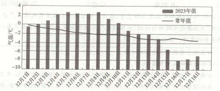 2023 年12 月14—17 日,我国出现大范围寒潮过程,此次过程具有影响范围广、持续时间长、累计降水量大、寒潮过后北方气温回升慢等特点。因为降温幅度大,部分民众对气象专家预测的“暖冬”提出了质疑。受全球气候变暖影响,西风急流减弱,导致北极地区冷空气南下,是此次强寒潮的主要成因。下图示意12 月1—18 日全国平均气温变化。据此完成12~14题。
