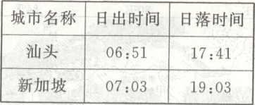 2024 年11 月17 日,新加坡华侨参加了第二十二届国际潮团联谊年会、第十届世界潮商大会(简称“两大盛会”),在会上为潮汕经济发展建言献策。11 月20 日下午,“两大盛会”圆满闭幕。下表示意冬至日汕头和新加坡的日出、日落时间(北京时间)。据此完成15~16题。