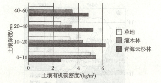 12.A 13.B 14.B [第12题,根据图中信息可知,三种植被类型0~60 cm土层中,有机碳密度(各土层有机碳密度之和)最大的为青海云杉林,其次为灌木林,最后为草地,A正确。第13题,根据图中信息可知,青海云杉林在0~10 cm土层土壤有机碳密度较小,主要原因在于云杉林生长在海拔高、气温低的地区,地表凋落物较少,有机物质来源较少,B正确;土壤表面温度越低、土壤微生物活性越小,土壤中有机质的分解越慢,越有利于土壤有机碳的积累,排除A、C;土壤含水量越高,土壤中有机质的分解越慢,土壤中有机碳的积累越多,排除D。第14题,根据所学知识可知,青海云杉林生长缓慢,适应性强,可耐$-30^{\circ }C$低温,耐旱、耐瘠薄,喜寒冷潮湿环境,祁连山排露沟流域的阴坡,气温较低,土壤较为潮湿,青海云杉林其生长,B正确。]