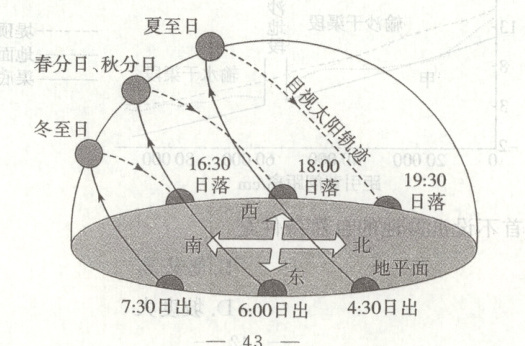 15.D 16.A [第15题,阳台一天内被太阳照射时间最长,应对应太阳位于偏南方位时间最长的一天。读图并结合所学知识可知,6月23日、7月23日、8月23日太阳直射点位于北半球,太阳东北升,西北落,由图可知,太阳位于偏南方向的时间小于秋分;9月23日为秋分日,太阳直射赤道,太阳正东升,正西落,升起后太阳马上就转至了偏南方位,正午太阳位于偏南方向的时间几乎等于12小时。综上所述,四选项中小明家阳台一天内被太阳照射时间最长的是9月23日,D正确。第16题,小明家阳台一天内被太阳照射时长相等的两个日期关于二至日对称即可,因此相差天数最少的两个日期为二至日前一天和后一天,相差2天,A正确。]