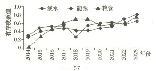 有序度表示子系统在整体系统发展中的协调水平(数值越大表示协调能力越强)。各子系统有序度高,能促使整体系统健康稳定发展。下图示意黄河流域2014—2023年淡水、能源、粮食子系统有序度演变过程。读图,完成4~6题。