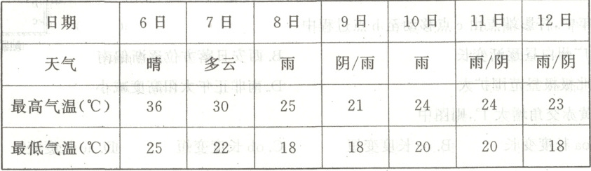 2023年5月,我国广西多地遭遇“倒夏寒”天气。下表示意南宁市5月6—12日的天气状况。据此完成10~11题。