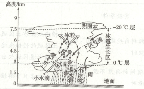 (1)题,本题考查冰雹的形成过程,根据材料和图进行分析,形成冰雹需要具备充足的水汽、强烈的对流天气及大气不稳定、迅速降温等条件。午后多上升气流,且对流旺盛,水汽随气流上升,遇冷降温后凝结成小水滴,当气温降至0℃以下时,水滴凝结成冰粒;冰粒在上升运动过程中,吸附周围小冰粒或水滴体积增大,当其重量无法被上升气流所承载时即下落;下沉冰粒遇到更强的上升气流再次被抬升,体积再增大,如此反复,冰粒体积越来越大,直到下落至地面形成冰雹。第