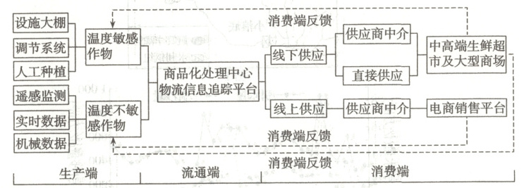 (1)题,结合图中信息可知,数字化生产在不同过程中的影响不同。在生产端:由于理塘县位于青藏高原东南缘,平均海拔为4 300米,海拔高,气温低,数字化技术可以减少恶劣的自然条件对农业生产带来的不利影响;同时,理塘县地广人稀,劳动力不足,数字化技术可以提高生产效率,在一定程度上缓解劳动力不足的问题;数字化技术可以进行实时数据监测,从而提高农产品的产量和质量,也可以实时反映市场状况,合理地调整农业生产规模和类型,更好地满足市场需求。在流通端:数字化技术的应用形成商品化处理中心和物流信息追踪平台,从而提高物流效率,有利于线上推广销售,从而扩大农产品的销售市场。在消费端:由于理塘县位于西部地区,远离消费市场,数字化技术可以通过线上推广,供应销售,扩大销售范围,同时反馈消费市场信息,合理调整农业生产。第
