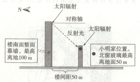 城市高大建筑的玻璃幕墙因反射太阳光常对居民造成一定的干扰。小明家坐北朝南,南北通透,每年有半年时间正午面临“两个太阳”(除南面太阳照射外,玻璃幕墙从北面反射阳光到室内,玻璃幕墙只考虑平面反射),如下图所示。据此完成15~16题。