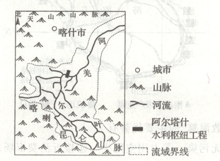如图为叶尔羌河流域示意图,随着阿尔塔什水利枢纽工程的启用,该流域的春旱缺水和千年水患问题得以明显改善。据此完成13~14题。