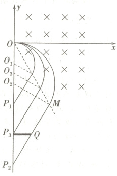(2)从加速器发射粒子速度大小$v$连续分布在$v_0$和$2v_0$之间。在选择器中的运动可视为以$v_0$沿CD运动的匀速运动与以$v - v_0$运动的匀速圆周运动的合运动。要求粒子从D点射出后均从O点沿x轴射入磁场,则有$L = v_0nT = \dfrac{2n\pi mv_0}{qB_1}(n = 1,2,3·s)$。