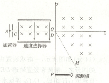 15. (18分)为探究带电粒子对探测板的作用力,探究小组设计的一实验装置如图所示,粒子源$S$、加速器出口、速度选择器中线$CD$、$x$轴置于同一水平线上。坐标系的第Ⅰ象限全部和第Ⅳ象限部分区域内存在有界磁场,边界$OM$满足$y=-\sqrt{3}x$。探测板$PQ$与$x$轴平行,$P$点在$y$轴上,位置可调,$PQ$长度为$l$。粒子源$S$正对加速器出口,单位时间释放$N_0$个粒子,粒子初速度大小连续分布在0和$\sqrt{3}v_0$之间,经加速后从$C$点射入速度选择器,从$D$点射出后均从$O$点沿$x$轴正方向射入磁场,在磁场中偏转后射出边界$OM$,打到探测板$PQ$上的粒子均匀分布在探测板上并被探测板吸收。其中,初速度为0的粒子恰好沿中线$CD$射出速度选择器。已知粒子的质量为$m$、电荷量为$-q(q>0)$,加速电压为$U=\frac{mv_0^2}{2q}$,速度选择器内的磁场和有界磁场的磁感应强度大小分别为$B_1$和$B_2$,方向垂直于纸面向里,$l=\frac{\sqrt{3}mv_0}{2qB_2}$。不计粒子的重力和粒子之间的相互作用力,粒子不会与速度选择器的极板碰撞。