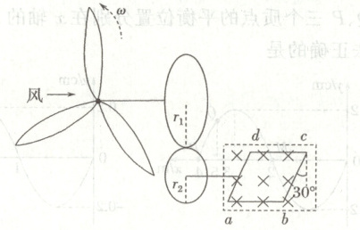 8. 如图所示是某物理兴趣小组设计的风力发电机的简易示意图,三个叶片的风轮在风力的作用下以一定的角速度转动,通过半径为$r_1$、$r_2$的齿轮装置增速轮增速,增速后带动发电机中的$n$匝矩形线圈$abcd$转动,线圈的面积为$S$,总电阻为$R$,线圈处在方向垂直于纸面向里的匀强磁场中,磁感应强度为$B$。某段时间内,风轮以恒定角速度$\omega$沿逆时针方向(从右向左看)匀速转动,$t = 0$时刻,线圈平面与中性面(纸面)的夹角为$30°$,不计一切摩擦阻力,电流方向以$adcba$为正方向,下列说法正确的是
