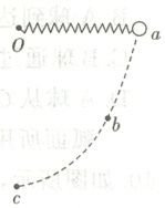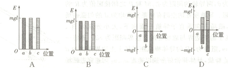 6. 如图,弹簧左端固定于$O$点,右端连接质量为$m$的小球(小球可看作质点,弹簧为原长$l$),将小球和弹簧从水平静止状态释放。弹簧始终在弹性限度内,不计一切阻力,以$a$点所在平面为参考面。图中表示重力势能,表示弹性势能,表示动能。下列四个选项中关于小球从$a$运动到$c$过程中,$a$、$b$、$c$三点机械能情况的描述可能正确的是