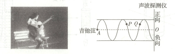 BC [探测仪从接收到第一个正向位移最大值到接收到第三个正向位移最大值共经历时间$\Delta t$,则有$\Delta t = 2T = \dfrac{2}{f}$,可得吉他弦在水中振动的频率为$f = \dfrac{2}{\Delta t}$,故A错误;吉他弦振动产生的声波在水中的波长为$\lambda = vT = \dfrac{v}{f} = \dfrac{v\Delta t}{2}$,故B正确;由题意,波向探测仪方向传播,根据“同侧法”可知,质点$P$正在向上振动,故C正确;做简谐振动的质点加速度方向总是指向平衡位置,可知质点$Q$此时的加速度方向向下,故D错误。故选B。]