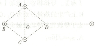 7. 如图所示,菱形$ABCD$的中心为$O$,在菱形的三个顶点$A$、$B$、$C$上各固定点电荷$+Q$、$+Q$、$-Q$。将一点电荷$+q$沿$BD$的延长线从无穷远处向$D$点移动,则在移动过程中