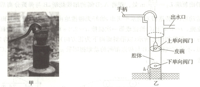13. (10分)为摆脱水源条件的限制,宋朝时人们就发明了一种能汲取地下水的装置—压水井。在汕头华侨公园的儿童玩水区,安放着如图甲所示的压水井让孩子们体验。压水井结构如图乙所示,取水时先按下手柄,同时带动皮碗向上运动,此时上单向阀门关闭;皮碗向上运动到某个位置时,下单向阀门被顶开,水流进入腔体内。设某次下压手柄前,腔体只有空气,空气的压强和体积分别为$p_{0}$和$V_{0}$,现研究缓慢下压手柄,直至下单向阀门刚被顶开的过程。已知大气压强为$p_{0}$,水的密度为$\rho$,下单向阀门质量为$m$,横截面积为$S$,下单向阀门到水面距离为$h(h < \frac{p_{0}}{\rho g})$,重力加速度为$g$。