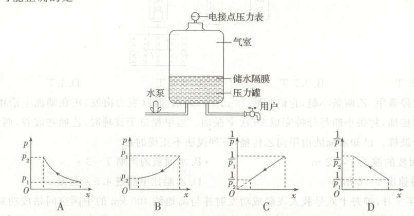 8.某压力罐的结构简图如图所示。当气室内的气体压强达到$p_1$时,电接点压力表立即接通电源,启动水泵给压力罐缓慢补水;当气体压强达到$p_2$时,电接点压力表便自动断开电源,停止补水。若压力罐的密闭性、导热性均良好,气室内的气体可视为理想气体,压力罐所处环境温度保持不变。设气室内气体的压强为$p$,储水隔膜到压力罐上端的距离为$x$,则在缓慢补水的过程中,下列图像可能正确的是