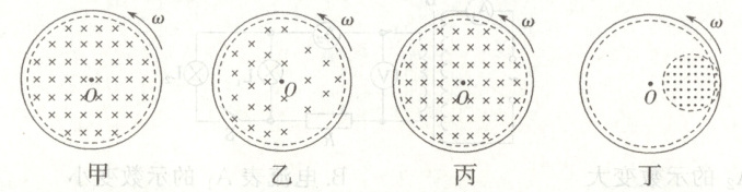 10.高铁利用磁刹车系统,某同学为研究其工作原理让铜盘处于磁场方向均垂直于其平面的磁场中进行实验。如图甲,圆形匀强磁场区域与铜盘是同心圆且面积小于铜盘面积;如图乙,磁场区域与甲相同,磁场的磁感应强度从左到右减小;如图丙,匀强磁场区域与甲相同,磁场的磁感应强度随时间均匀减小;如图丁,圆形匀强磁场区域处于铜盘的一侧。现给铜盘一初始角速度,整个过程忽略空气阻力和摩擦阻力的影响,忽略铜盘厚度,则铜盘能停下来的是