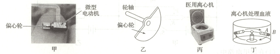 3. 圆周运动是一种常见的运动形式,在生活中有着广泛的应用。图甲是传统手机振动器,由一个微型的电动机加上一个偏心轮组成,图乙是偏心轮示意图。图丙是医用离心机,图丁是离心机处理血液的示意图。关于传统手机振动器和医用离心机,下列说法正确的是(