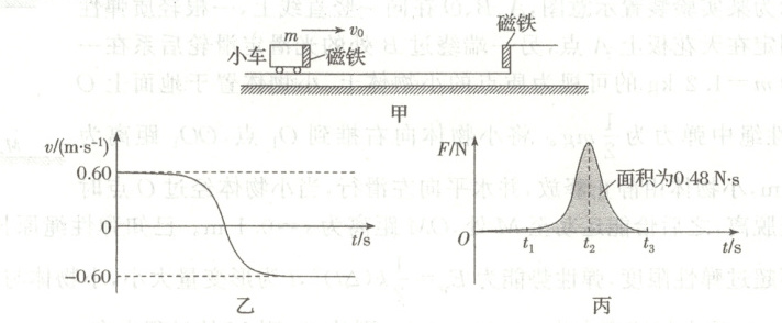 6.D [由题图乙可知,小车速度为零时,加速度最大,此刻所受合外力最大,故A错误;由题图丙可知,小车在$t_1\sim t_2$时间内受到的磁铁的力逐渐增大,向右做加速度逐渐增大的减速直线运动,在$t_2\sim t_3$时间内受到的磁铁的力逐渐减小,向左做加速度逐渐减小的加速直线运动,故B错误;根据题图乙可知,小车与固定在轨道上的磁铁相互作用过程中,动能先减小后增大,故其机械能先减小后增大,故C错误;小车在$t_1\sim t_3$时间内,根据动量定理公式可得$-Ft = -mv_0 - mv_0$,又因为$F - t$图像的面积表示冲量,可得$0.48\ N·s=2m×0.60\ m/s$,解得$m = 0.4\ kg=400\ g$,故D正确。]