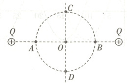 6. 如图所示,纸面内固定着两个等量的同种点电荷,它们之间的距离为$4R$。以其连线的中点$O$为圆心、$R$为半径画圆,$A、B、C、D$为圆周上的四个点,$A、B$两点在两点电荷的连线上,$C、D$两点在两点电荷连线的中垂线上。下列说法正确的是 (
