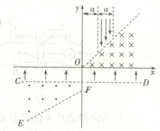 (3)所有电子都垂直于EF边界离开磁场,则所有电子运动轨迹的圆心都在EF直线上,由以上分析,经过直线CD时,不妨设任何电子的x轴负方向的分速度为$v_{x}' = k\frac{eBa}{m}(1\leqslant k\leqslant 2)$,则电子经过直线CD的合速度为$v_{合} = \sqrt{1 + k^{2}}\frac{eBa}{m}$,电子经过直线CD的坐标为$(-2ka, -a)$,速度方向与水平方向的夹角的正切值为$\tan\alpha = \frac{1}{k}$,则圆心位置为$(-2ka + a, -a - ka)$;因为电子垂直于直线EF出射,所以圆心也在直线上,可得EF直线为$y = \frac{1}{2}x - \frac{3}{2}a$。