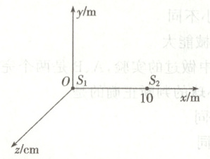 10. 如图所示,$x=0$与$x=10\ \mathrm{m}$处有两个波源$S_{1}$和$S_{2}$均可以沿$z$轴方向做简谐运动,两波源产生的机械波均能以波源为圆心在$xOy$平面内向各个方向传播,振动周期均为$T=2\ \mathrm{s}$,波速均为$v=1\ \mathrm{m/s}$。$t=0$时刻波源$S_{1}$开始沿$z$轴正方向振动,振幅$A_{1}=3\ \mathrm{cm}$;$t=2\ \mathrm{s}$时刻波源$S_{2}$开始沿$z$轴负方向振动,振幅$A_{2}=5\ \mathrm{cm}$。下列说法正确的是 (