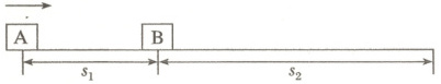 14. (14分)某同学在水平桌面上玩闯关游戏。在桌面最左端放置一质量$m_{\mathrm{A}}=0.1\ \mathrm{kg}$的小物体A(可视为质点),距离物体A为$s_{1}=1\ \mathrm{m}$处有一质量$m_{\mathrm{B}}=0.2\ \mathrm{kg}$的物体B(可视为质点),物体B距离桌面最右端为$s_{2}=2\ \mathrm{m}$,两物体在同一条直线上,如图所示。现使A以某一初速度沿直线向B运动,若A既能与B发生碰撞且碰后又不会滑离桌面,则闯关成功。已知A、B碰撞时间很短且碰后粘在一起,A、B两物体与桌面间的动摩擦因数均为$\mu=0.1$,重力加速度大小为$g=10\ \mathrm{m/s^{2}}$。为了确保闯关成功,求: