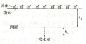 13. (10分)在一个平静的湖面上,距离水面高度$h_{1}=30\ \mathrm{m}$处缆车 缆索上每隔$t=10\ \mathrm{s}$就从站台以速度$v=$ 缆索