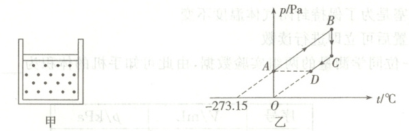 8. 如图甲所示,活塞将一定质量的理想气体封闭在汽缸内。设法让汽缸中的气体经历$A\to B\to C\to D$的变化,气体的压强与摄氏温度的关系如图乙中实线所示。图乙中$O$为坐标原点,$A$在$p$轴上,$AB// DC$,$BC// AO$,$AD// t$轴,$BA$的延长线经过$(-273.15,0)$,$CD$的延长线经过$O$。关于气体各个阶段的情况,下列说法正确的是