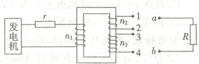 7.D [如图所示,将变压器及右侧部分等效为一个电阻$R'$,当$a、b$端与副线圈绕组按不同方式连接时,副线圈等效匝数设为$n'_{2}$,设原线圈两端电压、流过的电流分别为$U_{1}、I_{1}$,电阻$R$两端的电压、流过的电流分别为$U_{2}、I_{2}$,则有$R' = \frac{U_{1}}{I_{1}} = \frac{\frac{n_{1}}{n'_{2}}U_{2}}{\frac{n'_{2}}{n_{1}}I_{2}} = \frac{n^{2}_{1}}{n'^{2}_{2}}\frac{U_{2}}{I_{2}} = \frac{n^{2}_{1}}{n'^{2}_{2}}R$,设发电机输出电压有效值为$E$,等效电阻$R'$的功率为$I^{2}_{1}R' = (\frac{E}{r + R'})^{2}R' = \frac{E^{2}}{\frac{r^{2}}{R'} + R' + 2r}$,当$\frac{r^{2}}{R'} = R'$时,等效电阻$R'$的功率$P'$有最大值,此时$R' = r$。当$a$端接1,$b$端接2时,副线圈等效匝数为$n_{2} = 50$,$R' = \frac{n^{2}_{1}}{n^{2}_{2}}R = 8\ \Omega$;当$a$端接3,$b$端接4时,副线圈等效匝数为$n_{3} = 150$,$R' = \frac{n^{2}_{1}}{n^{2}_{3}}R = \frac{8}{9}\ \Omega$;当2、3连接,$a$端接1,$b$端接4时,副线圈等效匝数为$n_{3} + n_{2} = 200$,$R' = \frac{n^{2}_{1}}{(n_{3} + n_{2})^{2}}R = \frac{1}{2}\ \Omega$;当1、3连接,$a$端接2,$b$端接4时,副线圈等效匝数为$n_{3} - n_{2} = 100$,$R' = \frac{n^{2}_{1}}{(n_{3} - n_{2})^{2}}R = 2\ \Omega$,此时$R' = r$,等效电阻$R'$的功率$P'$有最大值,即电阻$R$的功率最大。故选D。]