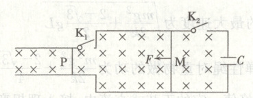 $K_2$和电容器,电容器的电容$C=0.1 F$;窄轨部分间距为$1.0 m$,右端连接有开关$K_1$,整个空间