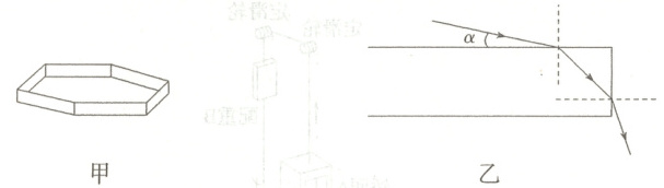 4. 倒挂的彩虹被叫作“天空的微笑”,是由薄且均匀的卷云里面的大量扁平的六角片状冰晶(如图甲所示)折射形成的。光线从冰晶的上表面进入,经折射从侧面射出,当太阳高度角$\alpha$增大到某一临界值时,侧面的折射光线因发生全反射而消失不见,简化光路如图乙所示,以下分析正确的是