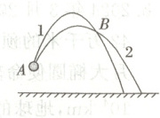 5. 2024年8月10日,中国运动员宋佳媛荣获巴黎奥运会田径女子铅球决赛铜牌。若她将同一铅球(可看作质点)从空中同一位置$A$点先后两次抛出,第一次抛出时铅球在空中运动的轨迹如图中1所示,第二次抛出时铅球在空中运动的轨迹如图中2所示,两轨迹的交点为$B$,不计空气阻力。关于两次抛出的情况,下列说法正确的是