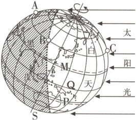 16. 读地球上的昼夜分布示意图,完成下列问题。