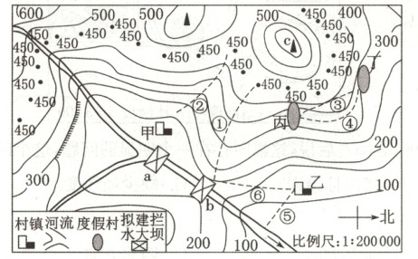 (填地形类型)。为解决乙村饮水困难问题,在该区域拟修建一座水库,水坝位置应布局在a、b两地中的b