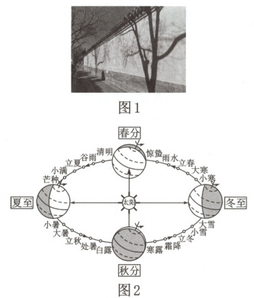 济南市$(36°40'N,117°02'E)$某中学地理兴趣小组在学校附近拍下了一张“白墙树影”的照片(图1),此时树干地面影子刚好与东西向白墙垂直。图2为二十四节气示意图。据此完成5~6题。