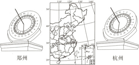 (传统文化)日晷是古人利用日影测得时刻的一种计时仪器。一天中,随着时间的推移,晷针投影的长度和方向会发生变化。下图为郑州某地和杭州某地相同时刻日晷晷针投影示意图。读图,完成3~4题。