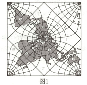 图 1 为运用皮尔斯梅花投影方法绘制的世界地图,图中①~⑦代表七大洲,同一序号代表相同大洲。读图,完成 11~13 题。