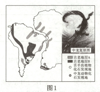 考古学家们认为,中龙是生活在古生代的一种淡水爬行动物,其化石仅发现于非洲和南美洲南部。读南美洲和非洲的古老地层及动、植物化石相似性图(图 1),完成 32~34 题。