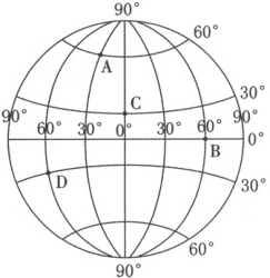 图中$D$点所在经线,经度向西增大,所以是西经,度数为$60^{\circ}W$;$D$点所在纬线,纬度向南增大,所以是南纬,度数为$30^{\circ}S$。