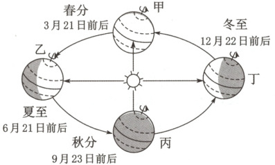 8. 地球公转轨道顺序为甲(春分3.21)→乙(夏至6.21)→丙(秋分9.23)→丁(冬至12.22)。记录时段白昼变长,北半球白昼变长时段为春分后至夏至前(甲→乙),此时段日出渐早、日落渐晚,与表格数据一致,故选A。
