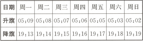 7. 计算每天白昼时长(降旗时间-升旗时间):周一14h04′、周二14h06′、周三14h08′、周四14h10′、周五14h12′、周六14h15′、周日14h17′,白昼时间逐渐增加,故选C。