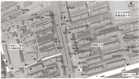 小明在学习了地图的知识后,基于电子地图标注了家校位置示意图,如图所示。图中芳清园小区8号楼是小明的家,北京石油学院附属实验小学是小明就读的小学,北师大二附中海淀学校是小明现在就读的初中。读图,完成5~7题。