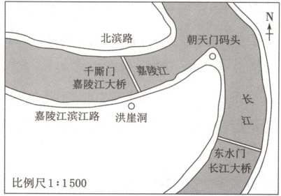 洪崖洞是重庆网红景点之一,深受游客的喜爱。许多省外游客一般会提前查看地图做好攻略,借助网约车出行直奔洪崖洞景区。读图,完成8~9题。