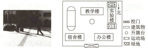 烟台某校地理小组开展了为期一年的实践活动,包括观测校园旗杆影子及其变化、绘制校园平面图等。下图为在教学楼前测量时拍摄的照片及绘制的校园平面图。读图,完成18~22题。