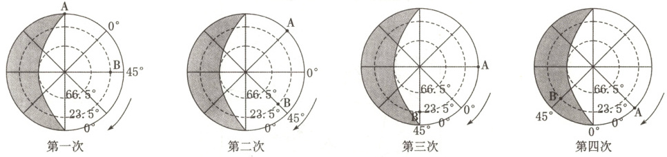地球上,经度每相差15°,时间约相差1小时。下面为每隔3小时从极地上空同一位置四次俯视地球示意图。图中阴影部分表示黑夜,圆圈表示纬线,直线表示经线,箭头表示地球自转方向。据此回答13~14题。