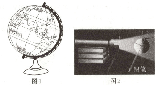 地球仪是地球的模型( 图1 ),是学习地理的重要工具之一。为了能够更好地认识地球,同学们制作了简易的地球仪( 图2 ),通过转动地球仪可以演示地球的自转运动。读图,完成21~23题。