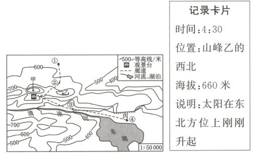 (2024·山东临沂)我国北方东部沿海地区某中学学生到学校附近的西山进行研学旅行。下图为西山及其附近等高线示意图和研学的记录卡片。据此完成6~7题。