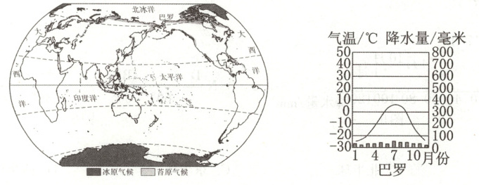 小组同学在老师的帮助下,了解到寒带气候主要分布在南、北极圈以内。下图为小组同学查阅到的寒带气候分布图和巴罗气温年变化曲线和逐月降水量图。据此完成32~33题。