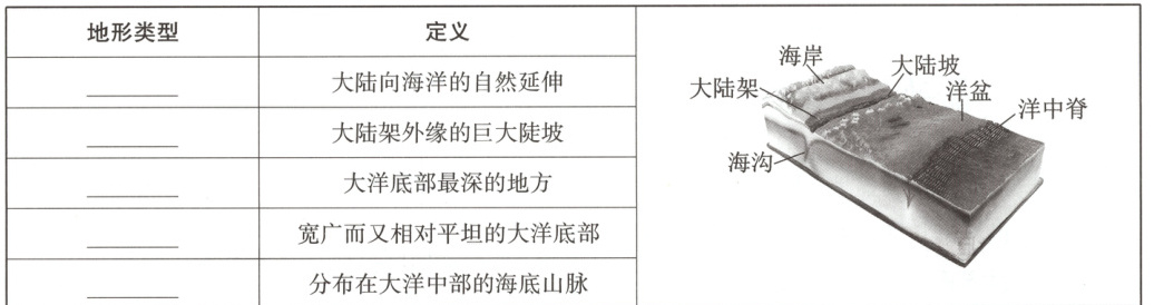 1. 大陆架;大陆坡;海沟;洋盆;大洋中脊