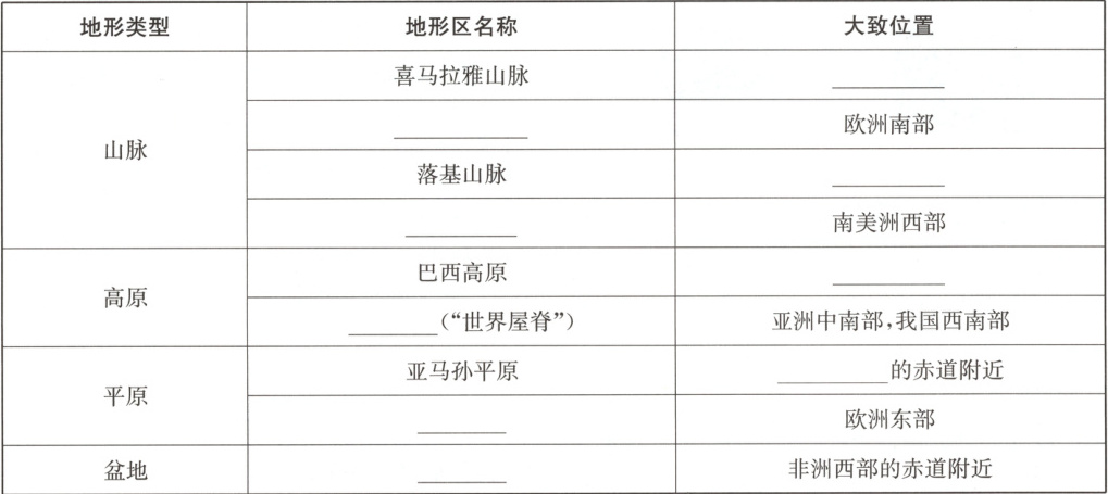 | 高原 | 青藏高原(“世界屋脊”) | 亚洲中南部,我国西南部 |